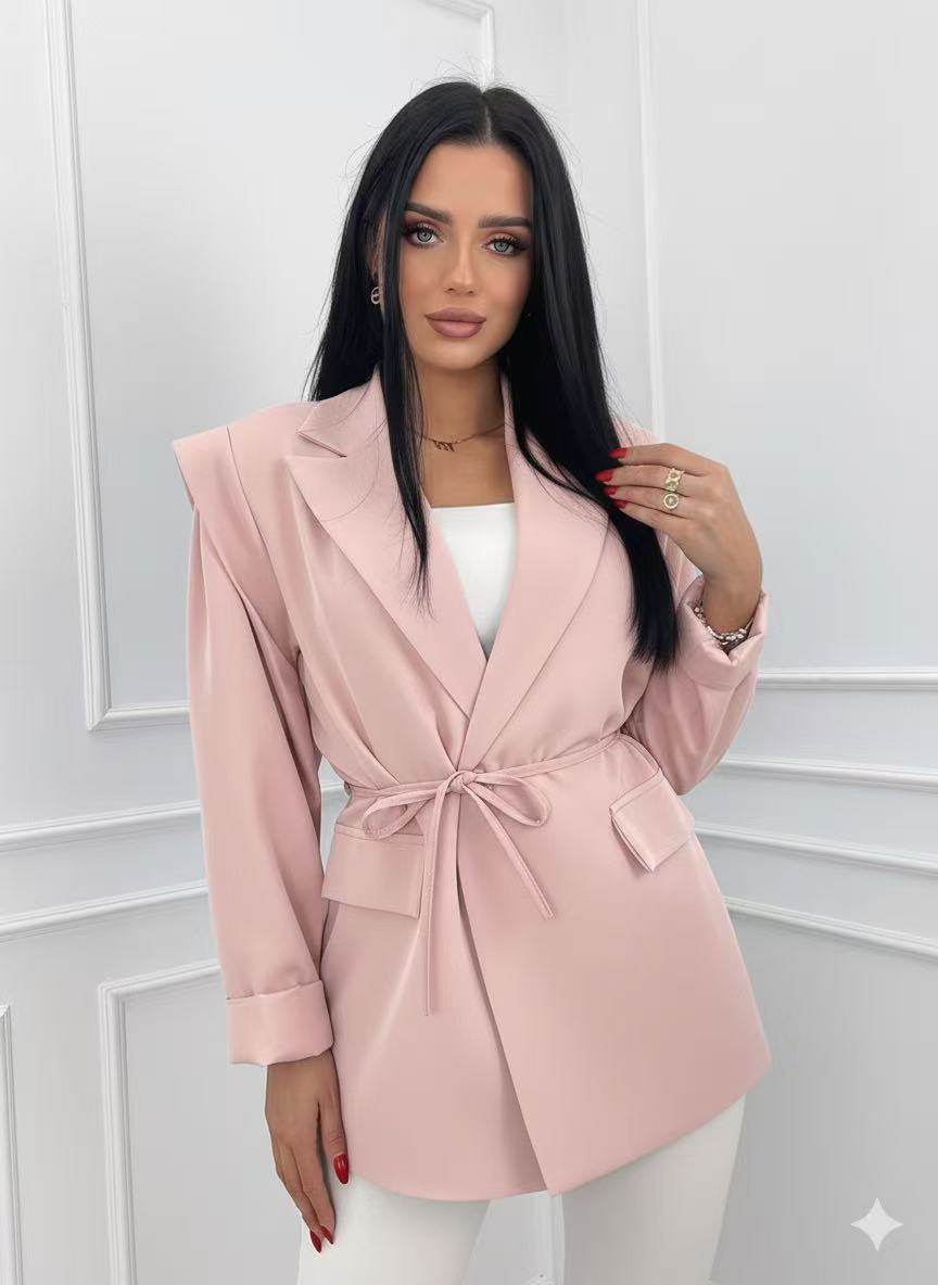 Κομψό και ιδιαίτερο σακάκι blazer με κορδόνι που δένει στη μέση. Διαθέτει φόδρα εσωτερικά, βάτες στους ώμους και διακοσμητικές τσέπες στα πλαϊνά.