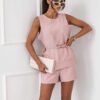 Σετ σορτς και αμάνικη μπλούζα. Η μπλούζα είναι crop με άνοιγμα και φιόγκους στην πλάτη. Το σορτσάκι είναι ψηλόμεσο και διαθέτει λάστιχο στη μέση, κουμπί και φερμουάρ μπροστά.